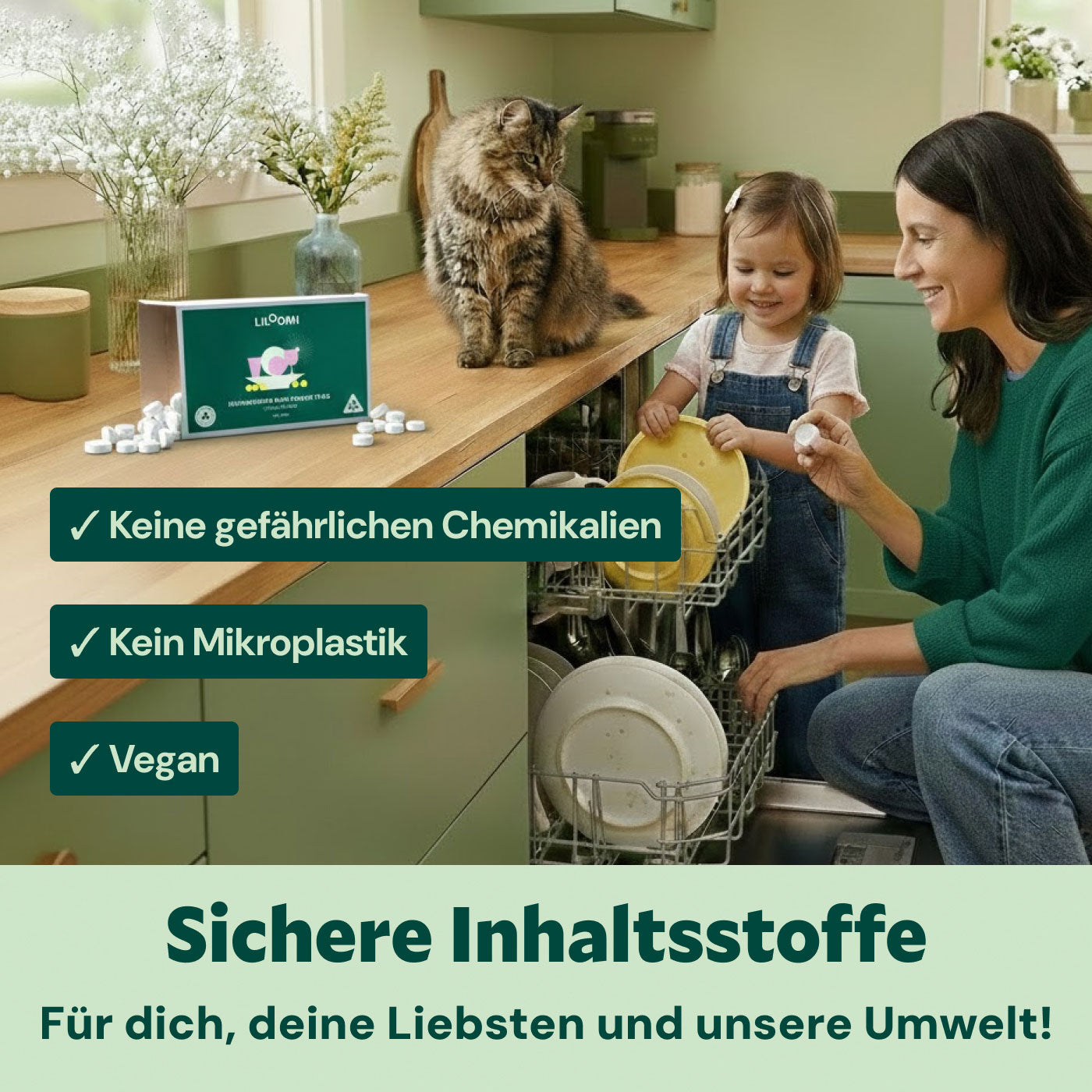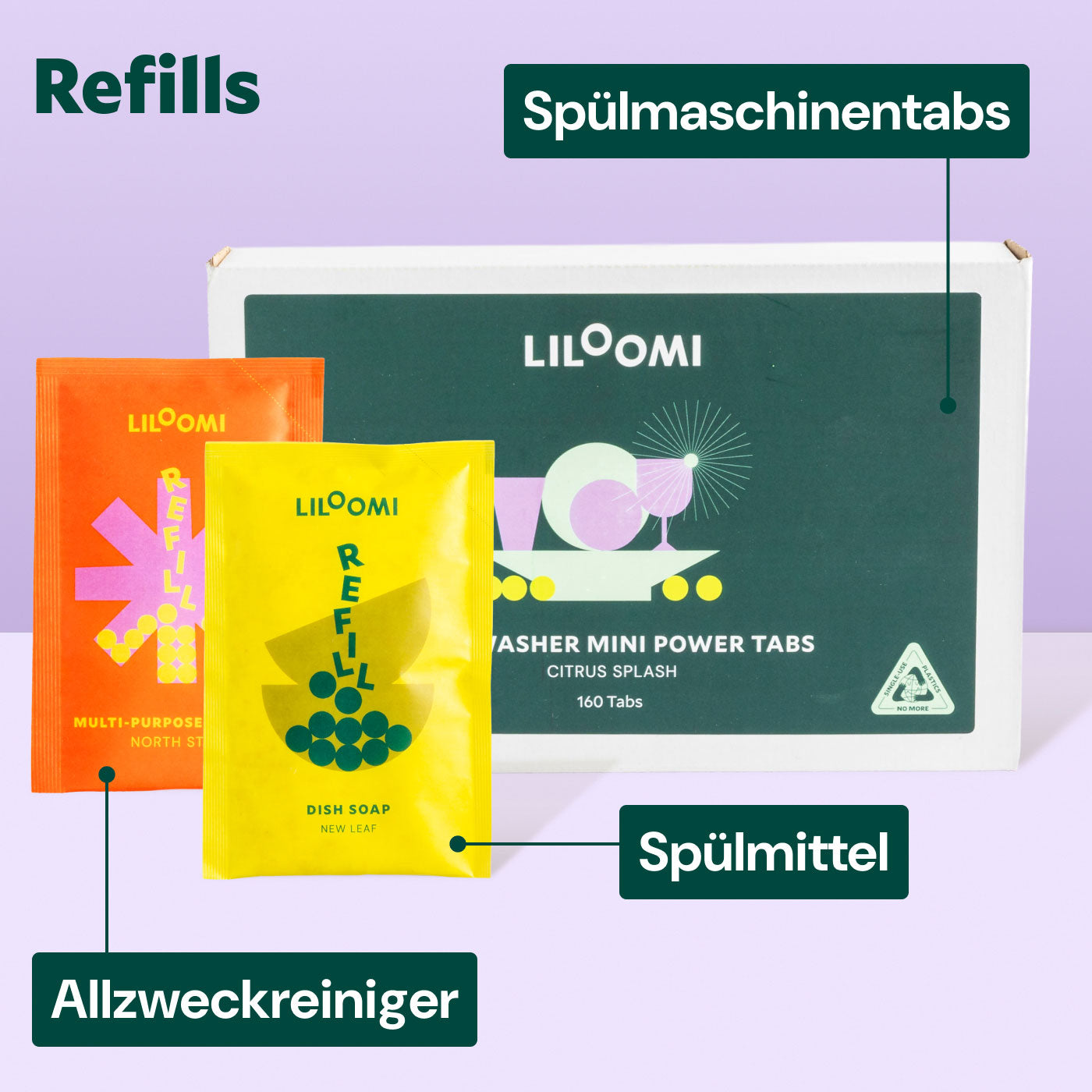 Du sparst 12,50€ gegenüber Einzelkauf und erhältst kraftvolle, mikroplastikfreie und hautfreundliche Küchenhelfer, perfekt abgestimmt auf deine Haushaltsgröße – ausreichend für zwei oder mehr Monate inkl. Spülmittel, Allzweckreiniger und Spülmaschinentabs.