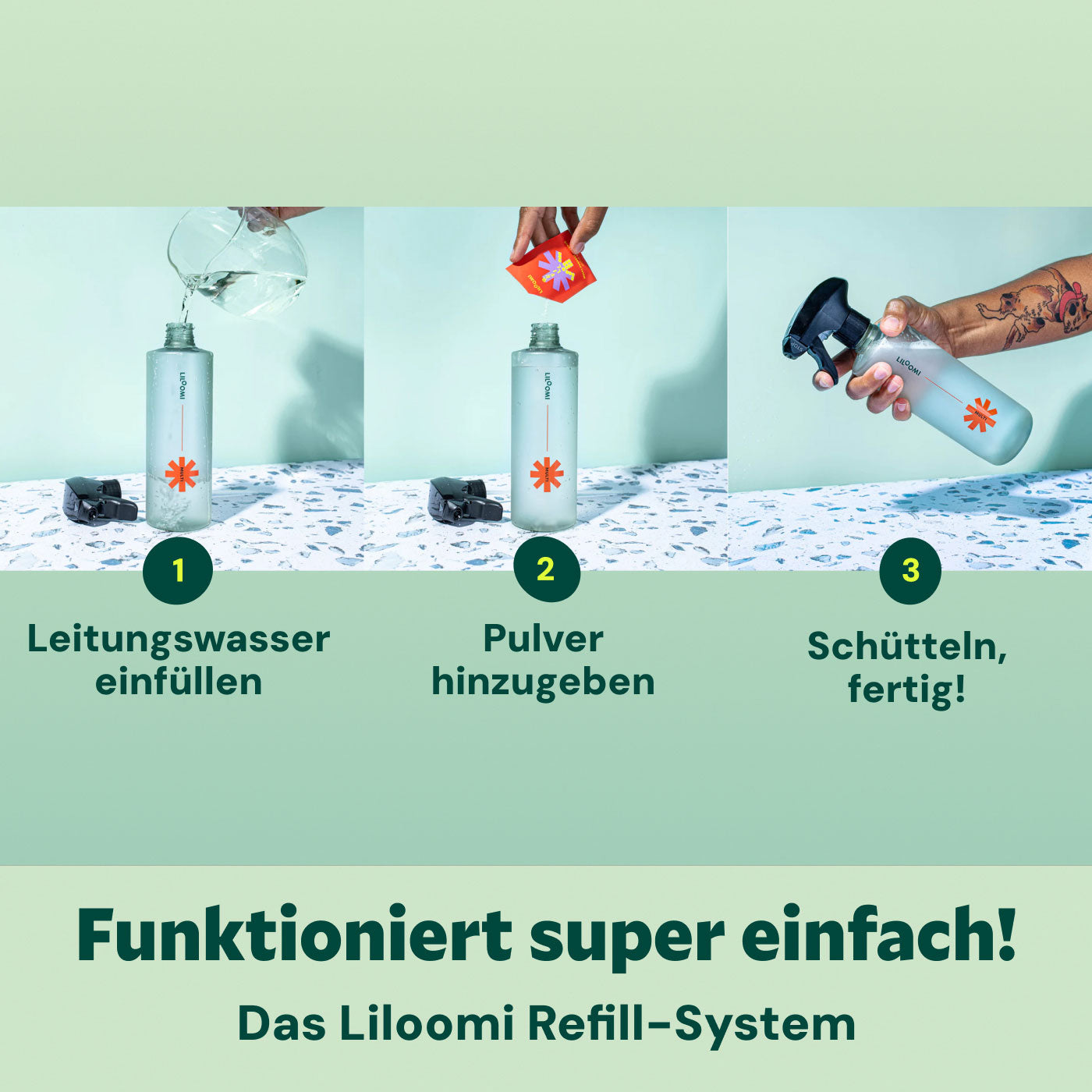 Fülle deine Flasche mit Wasser, gib das Liloomi-Pulver dazu und schüttle es wie einen Mai Tai. Danach bitte nicht trinken, sondern zur Reinigung verwenden.