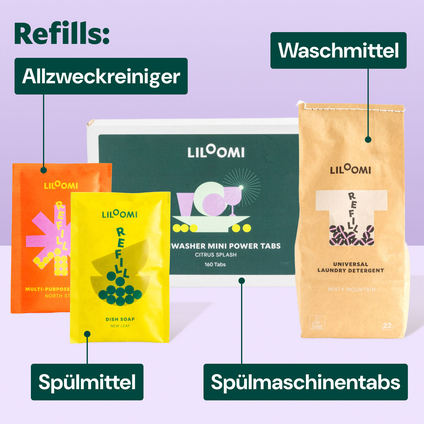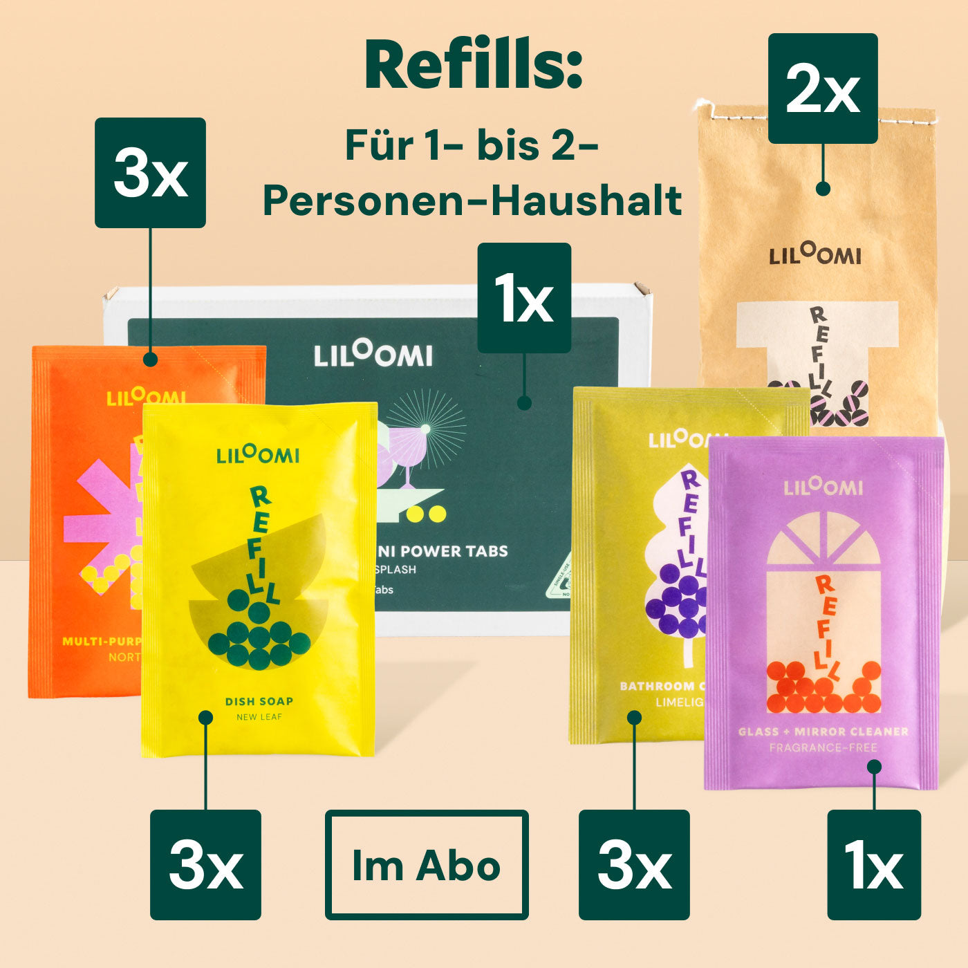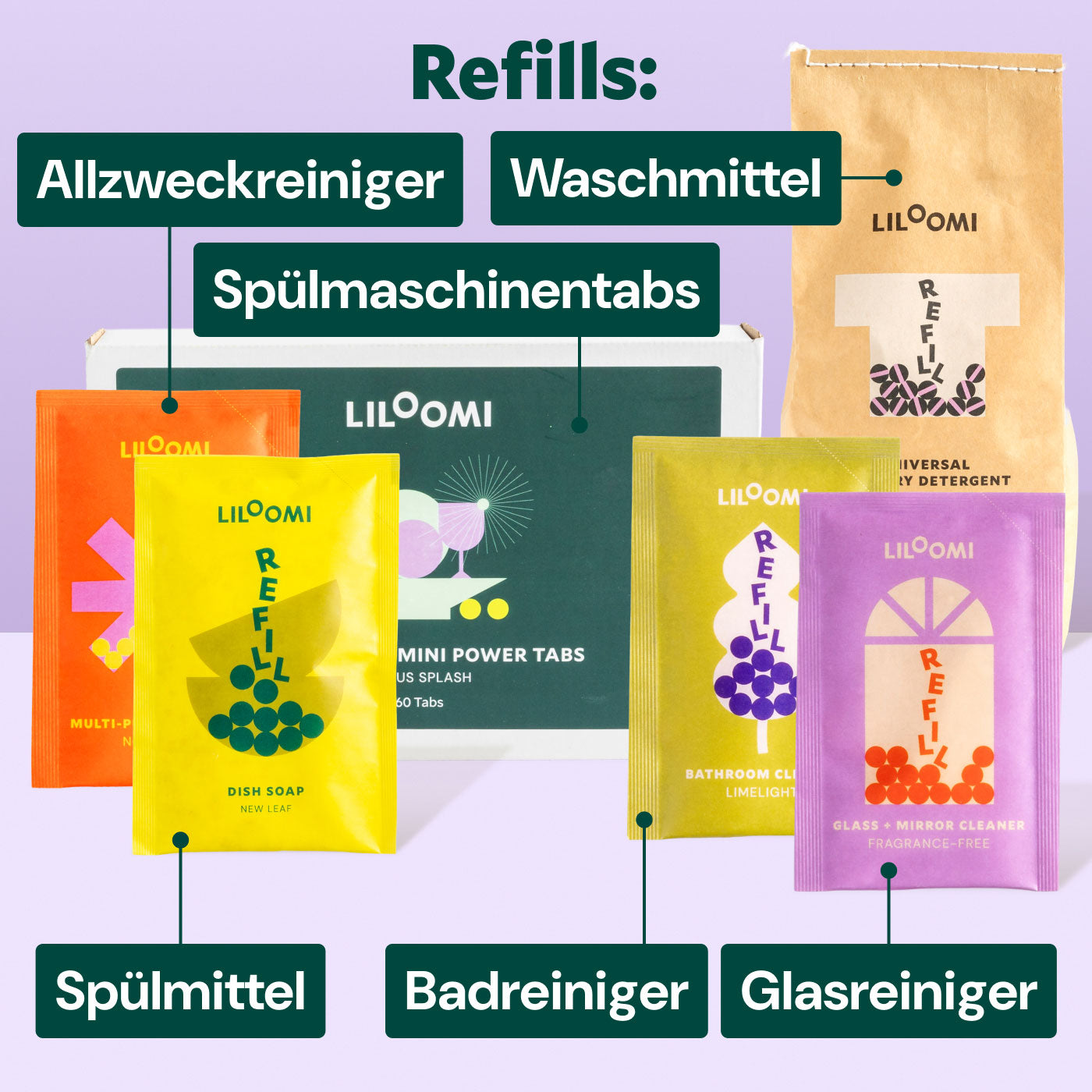Du erhältst kraftvolle, mikroplastikfreie und hautfreundliche Reinigungsmittel, perfekt abgestimmt auf deinen Haushalt – ausreichend für drei Monate inkl. Spülmittel, Allzweckreiniger, Glasreiniger, Badreiniger, Vollwaschmittel und Spülmaschinentabs.