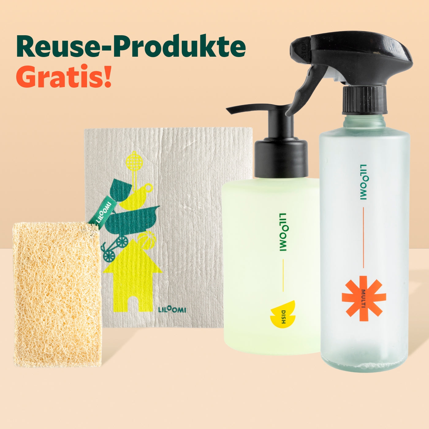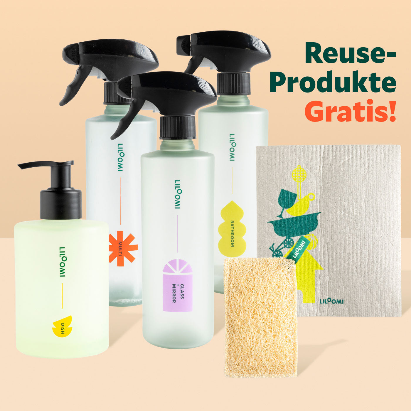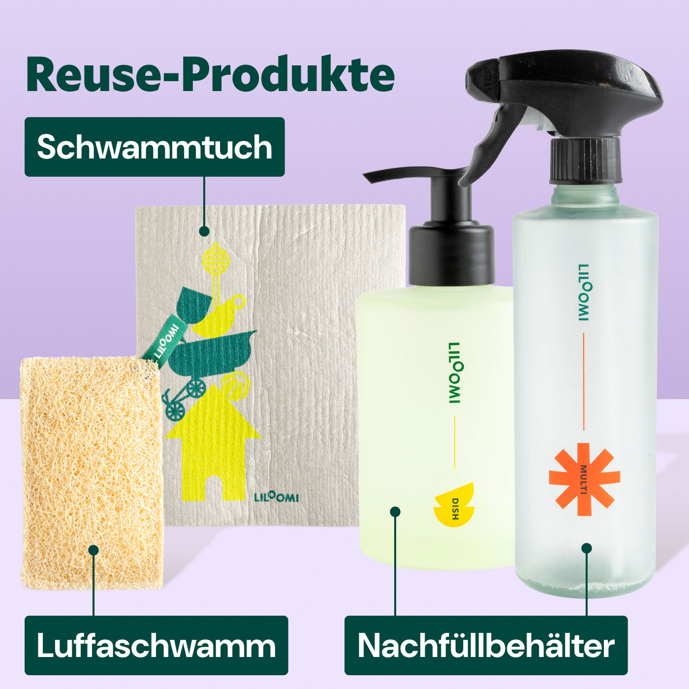 Du erhältst kraftvolle, mikroplastikfreie und hautfreundliche Reinigungsmittel, perfekt abgestimmt auf deinen Haushalt – ausreichend für drei Monate inkl. Spülmittel, Allzweckreiniger, Glasreiniger, Badreiniger, Vollwaschmittel und Spülmaschinentabs.