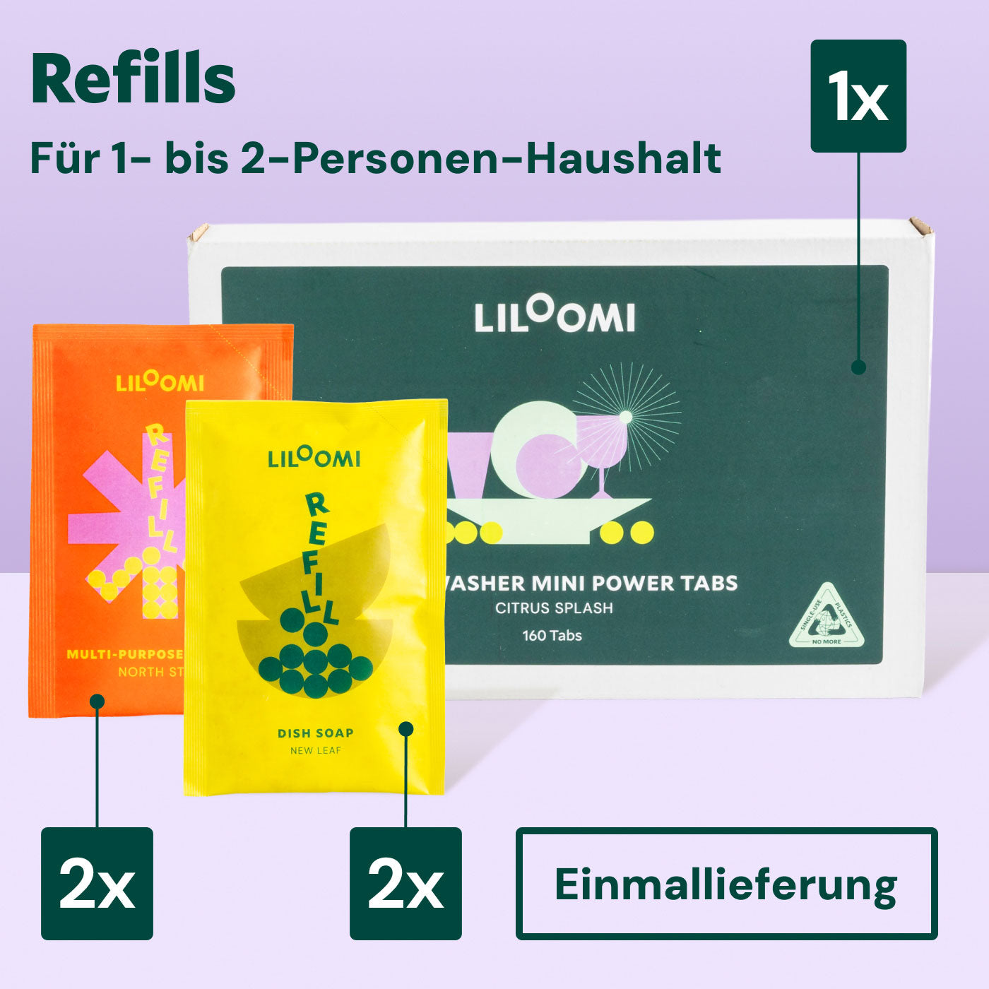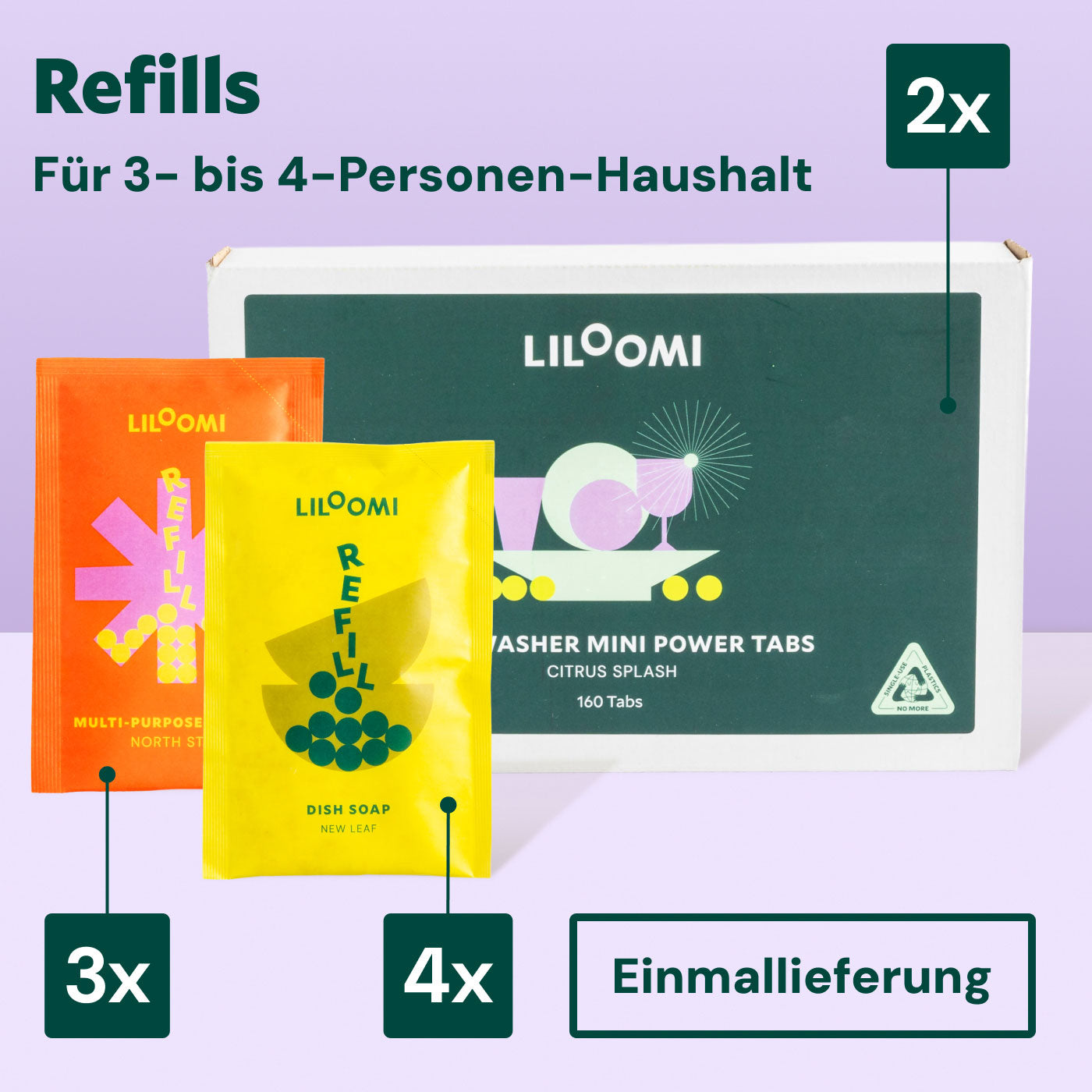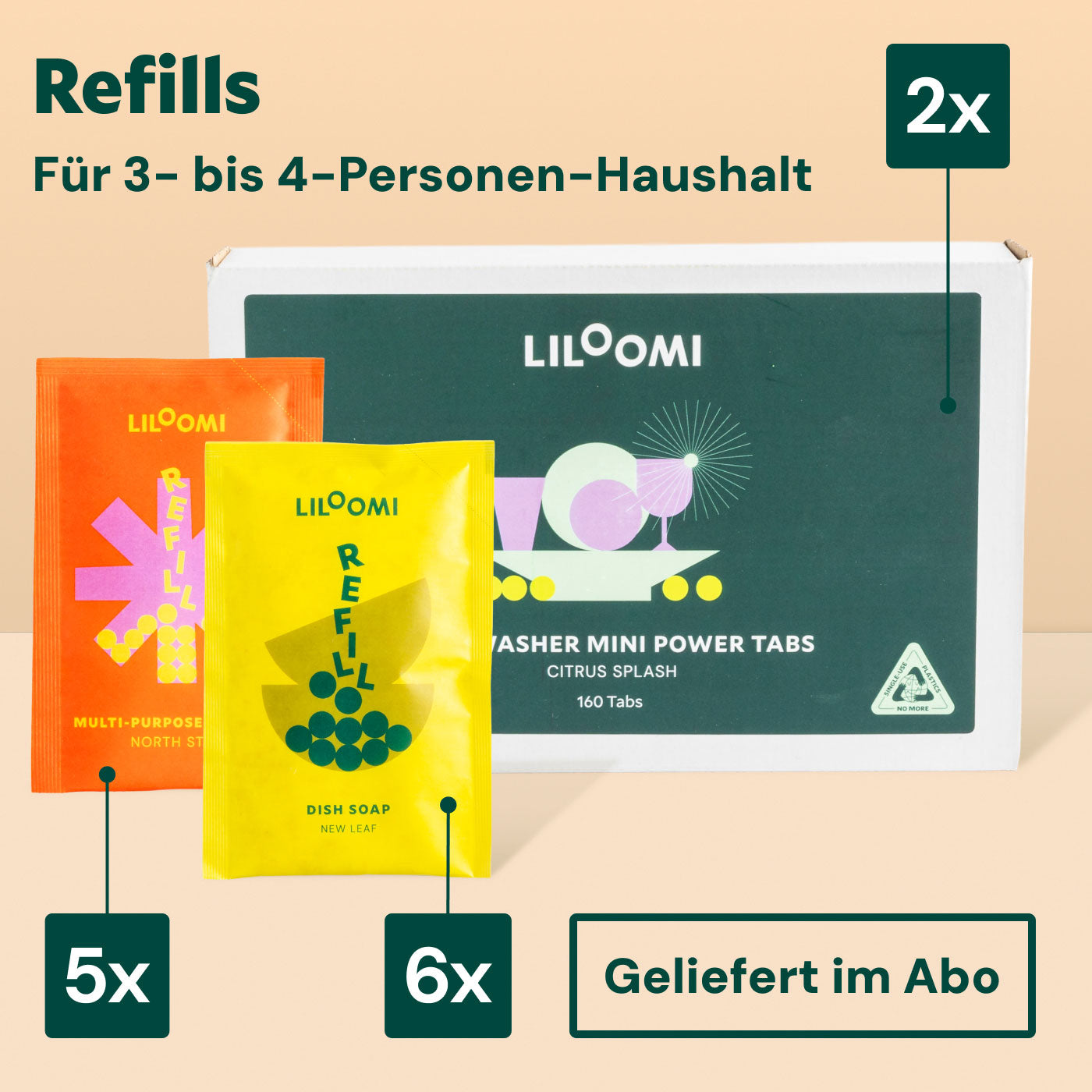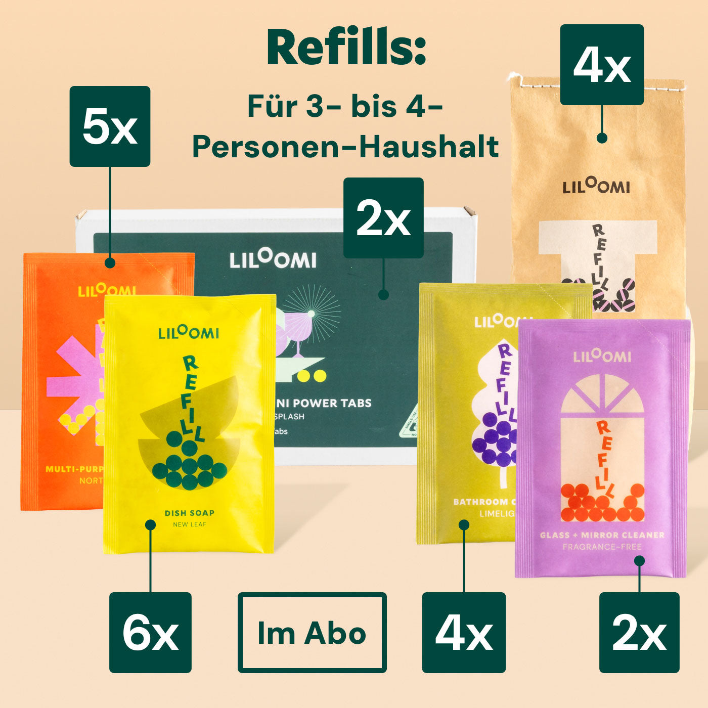 Du erhältst kraftvolle, mikroplastikfreie und hautfreundliche Reinigungs- und Waschmittel für Küche & Waschen, perfekt abgestimmt auf deine Haushaltsgröße – ausreichend für drei Monate inkl. Spülmittel, Allzweckreiniger, Vollwaschmittel und Spülmaschinentabs.