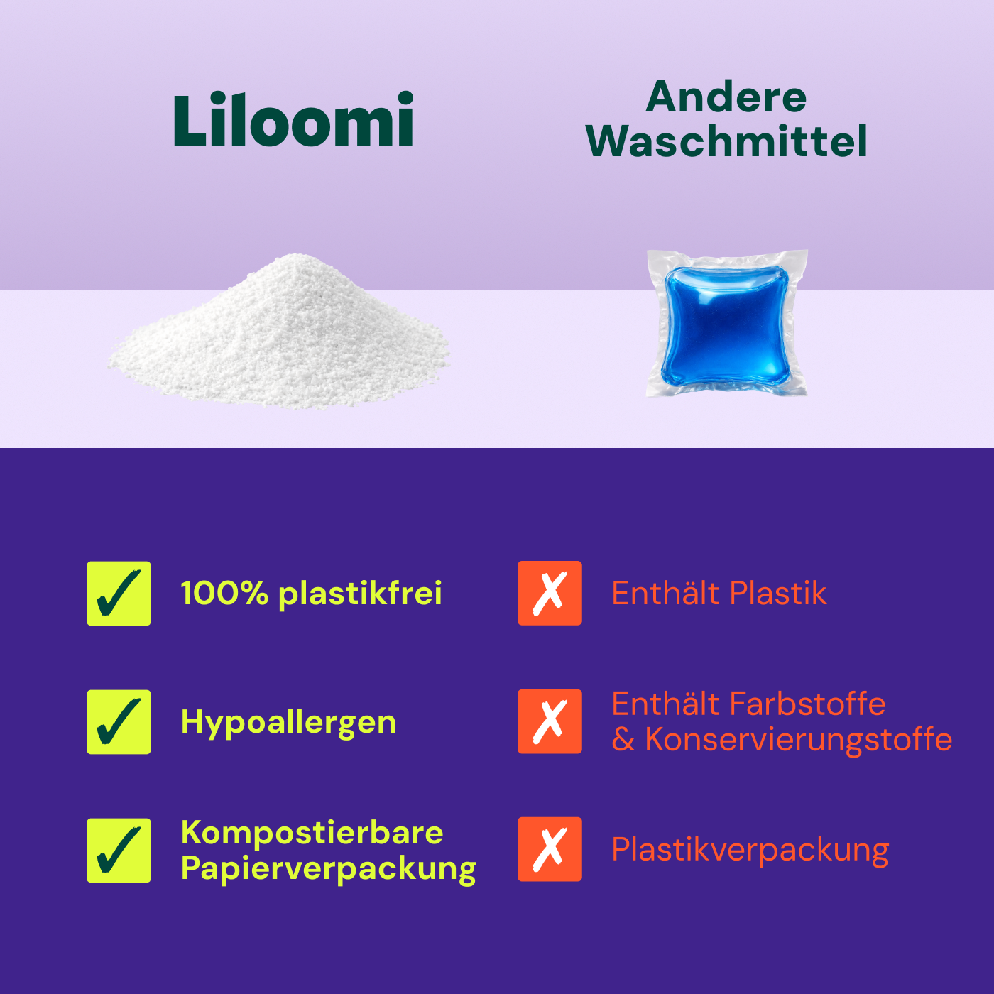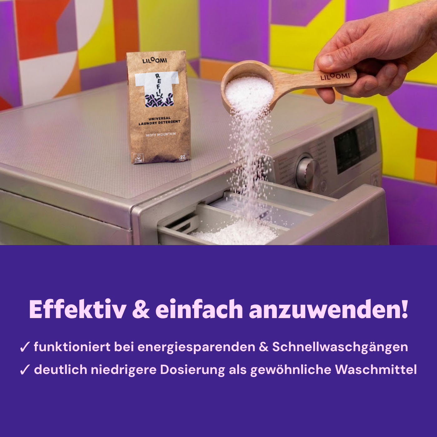 Geeignet für weiße und farbechte Wäsche. Beste Waschergebnisse bei Temperaturen zwischen 30°C und 90°C. Nicht für Wolle und Seide geeignet. Die Pflegehinweise in der Kleidung beachten. Die Dosierungsempfehlung auf der Verpackung befolgen, um gute Waschergebnisse zu erzielen, ohne Produkt zu verschwenden. Für die richtige Dosierung eignet sich unser Liloomi-Scoop. Unterfüllen der Trommel vermeiden und bei möglichst niedrigen Temperaturen waschen, um die Umwelt zu schonen.